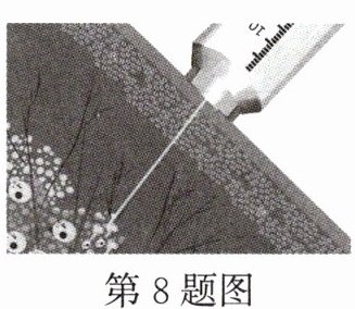 8. 电动式无针注射器广泛应用于胰岛素、疫苗、医美、动保免疫等领域,如图,该注射器通电时,通电线圈在永磁体产生的磁场中受到强大的推力,将药液高速注入皮肤. 下列关于无针注射器的说法正确的是(