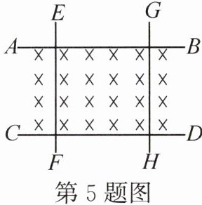 5. 如图所示,AB 和 CD 是两根固定且平行的水平金属导轨,符号“×”表示磁感线方向垂直于纸面向里.现将铜棒 EF 和 GH 垂直放在金属导轨上,当拉动 GH 左右移动时,发现 EF 也发生移动,则 GH 棒上发生的能量转化是