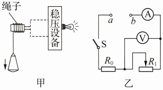 (4)取下灯泡,将甲图装置的两个输出端接入乙图中的 a、b 两个接线柱进行实验(设该装置在短时间实验过程中可以稳定输出 3.6 V 电压). R₀ 为标有“5 Ω 0.3 A”的定值电阻,滑动变阻器 R₁ 标有“50 Ω 1 A”,电流表选择量程为 0~0.6 A,电压表选择量程为 0~3 V.为了保证电路安全,滑动变阻器接入电路的阻值变化范围是