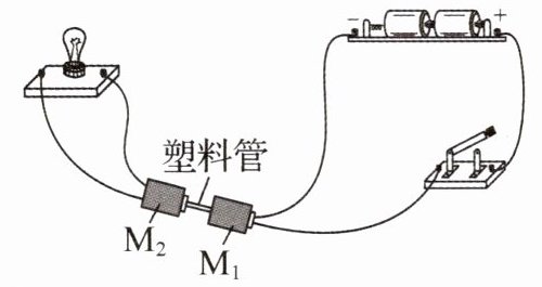 9. (2025·四川成都)将两个玩具电动机 M₁、M₂ 的转轴用塑料管连接起来,如图.闭合开关,小灯泡发光,原因是 M₁ 带动 M₂,让 M₂ 的线圈切割