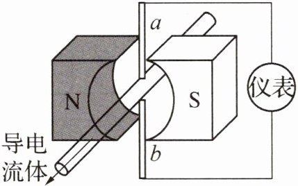 8. 亮点原创 电磁流量计广泛应用于工业生产中的液体流量监测,直流式电磁流量计的示意图如图所示.当管道内有导电流体通过时,就会有微弱电流产生,仪表(由电压表改装而成)就会显示出流体流速.电磁流量计的工作原理与