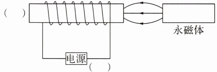8. 根据图中永磁体与通电螺线管之间的磁感线,标出永磁体的 N 极,并在括号内标出:通电螺线管左端的磁极和电源右端的极性.
