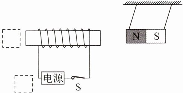 6. 如图所示,在螺线管旁悬挂一条形磁体,闭合开关后,条形磁体向左偏,请在虚线框内标出螺线管的磁极和电源的极性.