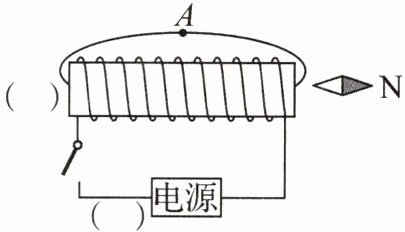 9. (2025·四川达州)如图所示,开关闭合后,小磁针静止时右端为 N 极.请在对应括号内和 A 点分别标出:
