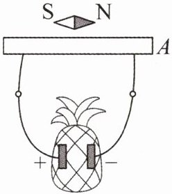 7. (2025·河南周口二模)将铜棒、铁棒插入菠萝中,便制成了一个水果电池.将一根软导线在纸筒 A 上绕制成一个螺线管线圈,导线两端接在水果电池两极上.螺线管周围放置的小磁针静止时如图所示,请画出纸筒 A 上导线的绕线.