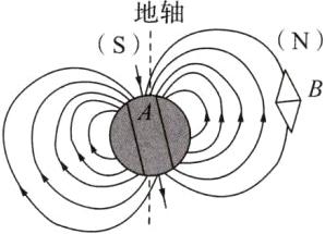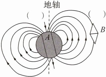 4. 如图是地球及地磁场的示意图,在 A 端旁括号中标出地磁场 A 端的极性,在 B 点小磁针旁括号中标出小磁针上端的极性.
