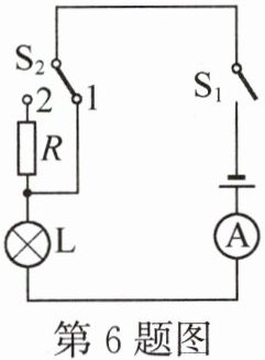 答案:6.(1)3W (2)①3.6V ②72J 解析:(1)$S_2$拨到1处时,闭合开关$S_1$,只有灯泡连入电路,此时灯泡两端电压$U_{L}=U = 6V$,则通过灯泡的电流$I_{L}=0.5A$,灯泡的功率$P_{L}=U_{L}I_{L}=6V×0.5A = 3W$。(2)①$S_2$拨到2处时,闭合开关$S_1$,灯泡$L$与定值电阻$R$串联,电流表示数为0.3A,则$I_{定}=I_{L}' = 0.3A$,$R$两端的电压$U_{定}=I_{定}R = 0.3A×12\Omega = 3.6V$;②灯泡两端的电压$U_{L}'=U - U_{定}=6V - 3.6V = 2.4V$,$L$工作100s消耗的电能$W = U_{L}'I_{L}'t = 2.4V×0.3A×100s = 72J$。