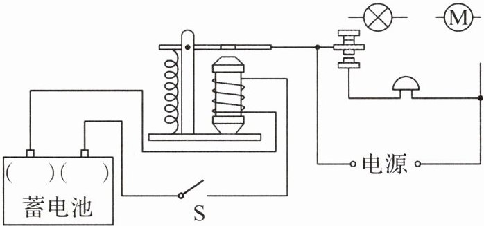 14. 如图所示的自动控制电路中,当开关 S 闭合时,只有电铃工作,电磁铁上端为 S 极;当开关 S 断开时,电铃不工作,电灯和电动机能独立工作.请标出左边控制电路中蓄电池的“+”极;把电灯和电动机按要求连入右边的工作电路(导线不要交叉).