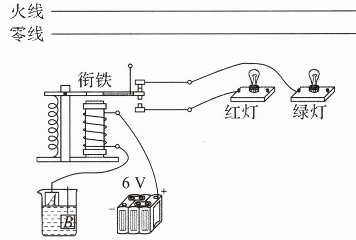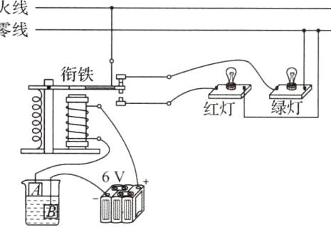 15. 某同学设计水位自动报警装置,主要元件有电磁继电器、红灯和绿灯(额定电压均为 220 V)、控制电路电源(电压为 6 V),控制电路断开,此时绿灯亮,控制电路接通,此时红灯亮.请用笔画线代替导线完成电路连接.