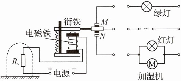 16. (2025·广东汕头一模)如图所示是蔬菜大棚湿度自动控制电路,$ R_s $ 为阻值随湿度增大而增大的湿敏电阻.当棚内湿度低于设定值时,红灯亮,加湿机启动,喷洒水雾加湿;棚内湿度高于设定值时,绿灯亮,加湿机停止工作.请连接好工作电路.
