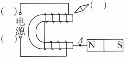 13. 如图所示,蹄形电磁铁右端放置一条形磁体,通电后发现条形磁体与蹄形电磁铁相互吸引.请画出 A 点磁感线的方向和电源的极性(用“+”或“-”表示),以及小磁针静止时右上端的磁极(用“N”或“S”表示).