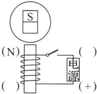 11. 如图 a 是一个磁悬浮地球仪,图 b 是其内部结构示意图,地球仪内部的条形磁体上端为 S 极,其下方的底座中有一个电磁铁,请在图 b 括号中标出开关闭合后电磁铁的 N 极和电源的“+”极.