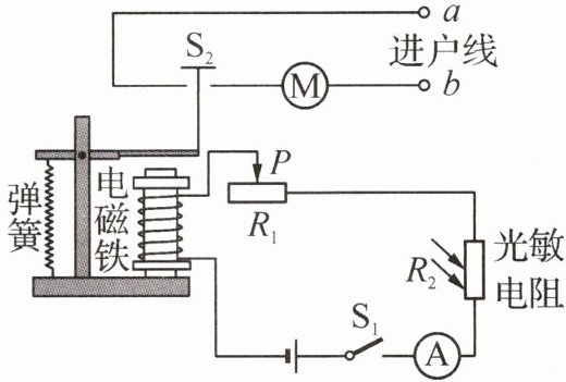 (选填“增大”或“减小”)。调试时发现,当户外紫外线增强到设定值时,$S_{2}$仍未闭合,为了达到设计要求,需要把滑动变阻器$R_{1}$的滑片$P$向