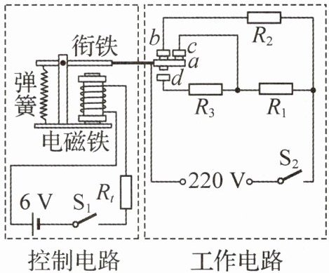 4. (2025·陕西渭南一模)科技小组的同学们设计了一种具有加热挡和保温挡的电热器,内部简化电路如图所示。其中$R_{t}$为热敏电阻,其阻值随温度的升高而减小。$R_{1}$、$R_{2}$、$R_{3}$均为电热丝,且$R_{1}=R_{2}=100\Omega$,闭合开关$S_{1}$、$S_{2}$,电热器开始工作。电磁铁的上端为