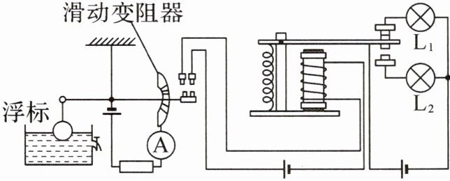 1. 如图是汽车油箱内监测油量的装置模型,电流表示显示油量,电磁继电器控制指示灯$L_{1}$、$L_{2}$。当油量减少时(