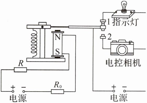 5. 如图所示是某“汽车超载记录器”原理图,$R$为力敏电阻,其阻值随压力增大而减小。当汽车不超载时,指示灯发光;当汽车超载时,电磁铁的磁性增强,电控相机自动照相。请正确连接右侧电路并根据左侧电磁铁的$N$、$S$极画出绕线。