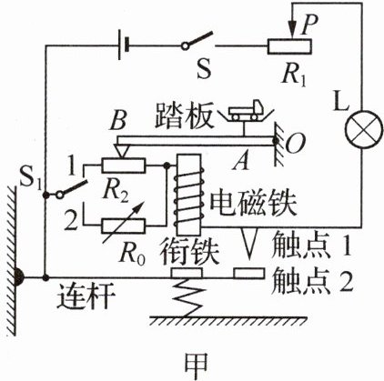 答案:3. (1) a (2) ① 15 ② 2 滑动变阻器的滑片$P ③ 1 (3) 18 V 10 \Omega (4) AC $解析:(1) 当车辆超载时,指示灯L闪烁报警,由图甲可知该装置使用时S₁接1,随着A处踏板所受压力的增大,电磁铁线圈中的电流变大,电磁铁磁性增强,吸引衔铁,使触点1和2接通,此时R₂和电磁铁被短路,通过L的电流变大,L变亮,同时电磁铁断电失去磁性,触点1、2分开,R₂和电磁铁又接入电路中,L变暗.由上述分析可知,R₂所受压力增大时,电路中电流变大,则此时R₂的阻值变小,因此应选图丙中a作为该电路的力敏电阻.(2) 当踏板上质量达到18 t时,由杠杆平衡条件可得$G_{车} × OA = F × (OA + AB),$解得$F = G_{车} × \frac{OA}{OA + AB} = m_{车} g × \frac{OA}{OA + AB} = 18 × 10^{3} kg × 10 N/kg × \frac{1}{1 + 5} = 3 × 10^{4} N,$由图丙可知,力敏电阻的阻值为$15 \Omega,$调试时是用电阻箱R₀代替报警时的力敏电阻,因此将滑片P移至最右端,电阻箱R₀应调至$15 \Omega,$闭合开关S;接下来开关S₁接2,调节变阻器的滑片P直至灯开始闪烁;开关S₁再接1,调试完毕,装置即可正常使用.(3) 当开关S₁接1时,R₂、L、R₁串联,车辆质量刚好为18 t时$R₂ = 15 \Omega,$装置报警,电路中的电流I₁ = 0.6 A,由图乙可知,此时L两端电压为3 V,电源电压$U = I₁R₂ + I₁R₁ + U_{L1} = 0.6 A × 15 \Omega + 0.6 A × R₁ + 3 V ①,$由(1)中分析可知衔铁被吸上后,R₀被短路,L和R₁串联,L变亮,此时L正常发光,其两端电压为额定电压9 V,由图乙可知,电路中的电流$I₂ = I_{L} = 0.9 A,$则电源电压$U = I₂R₁ + U_{L} = 0.9 A × R₁ + 9 V ②,$联立①②解得$R₁ = 10 \Omega,U = 18 V.(4) $增大承载质量,但装置报警电流不变时,B点所受压力$F_{B}$应保持不变,由杠杆平衡条件可得