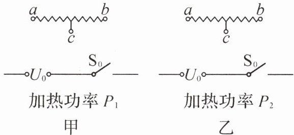 【改进设计】为获得不同的加热功率,从电热丝的中点处引出一条导线,将电热丝以不同方式连接在电压为 $ U_0 $ 的电源上,可以得到另外两个加热功率 $ P_1 $ 和 $ P_2 $,且 $ P_1 < P_2 $. 请你在图甲、乙中将各元件连接成符合改进要求的电路,并推导出 $ P_1 $ 与 $ P_2 $ 之比为