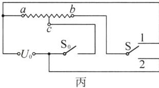 【优化设计】为方便操控,再增加一个单刀双掷开关 $ \mathrm{S} $,通过开关 $ \mathrm{S}_0 $ 的通断和 $ \mathrm{S} $ 在 $ 1 $、$ 2 $ 触点间的切换,实现加热垫 $ P_0 $、$ P_1 $ 和 $ P_2 $ 三挡功率的变换. 请你在图丙中将各元件连接成符合优化要求的电路. 注意:无论怎样拨动开关,不能出现电源短路.