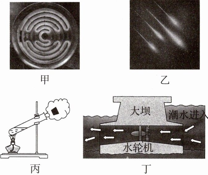 ① 图甲:高温的电炉丝使周围的空气温度上升 ② 图乙:流星从夜空快速划过发出耀眼的光亮 ③ 图丙:试管中高温水蒸气弹出管口的橡胶塞 ④ 图丁:涨潮时海水涌入水坝冲击水轮机转动