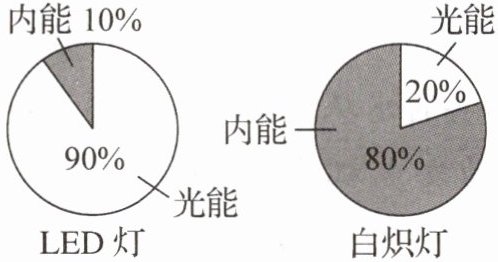 7. (教材 P103 素材变式)(2025·山东济宁一模)如图是“$ 220 V $ $ 5 W $”的 LED 灯和“$ 220 V $ $ 15 W $”的白炽灯正常工作时将电能转化为内能和光能的占比图. 当两灯均正常工作时,下列说法正确的是(