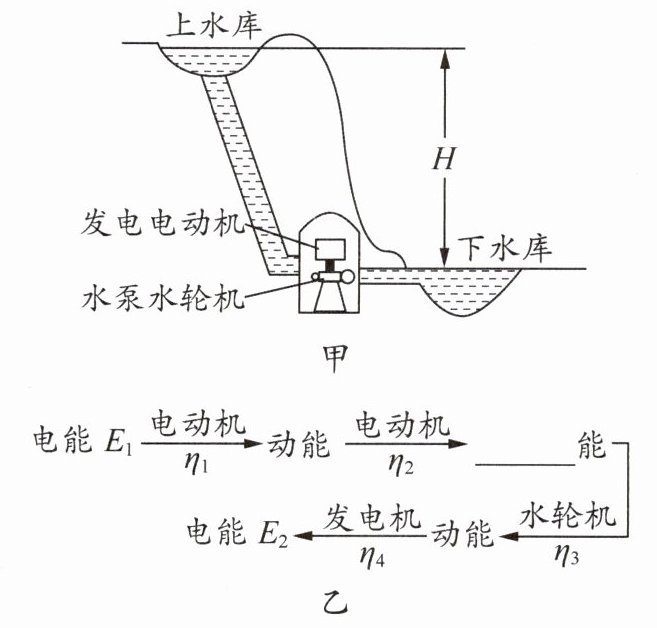 抽水蓄能电站是为了解决电网高峰与低谷之间的供需矛盾而产生的,是一种能够间接储存电能的设施,其工作原理如图甲所示. 后半夜用电低谷时,抽水蓄能电站从电网取电,用电动机驱动水泵,将水从下水库抽到上水库储存起来;次日白天和前半夜用电高峰时,再将水从上水库放出到下水库,使水轮机带动发电机发电,并将发出的电送入电网. 抽水蓄能电站的取电和发电过程中的能量流向如图乙所示.