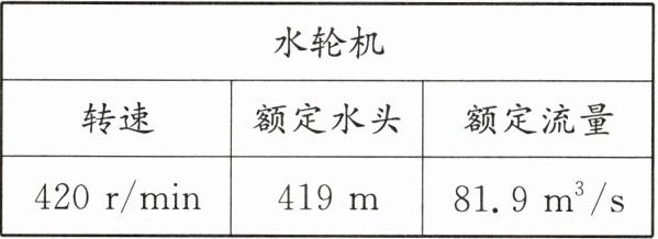 (4)发电机的效率$=\frac{电能}{动能}×100%=\frac{E_{2}}{E_{1}η_{1}η_{2}η_{3}}×100%.(5)$由表可知,水轮机的转速为420r/min=7r/s,则水轮机每转一圈需要的时间$t=\frac{1}{7}s,$所以,水轮机每转一圈流过水轮机的水的体积$V=Qt=81.9m^{3}/s×\frac{1}{7}s=11.7m^{3}.(6)$深蓄电站每年取电、发电可获得的差价为15亿千瓦时×1.3元/度-20亿千瓦时×0.3元/度×75%=15亿元.