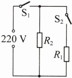5. 我国的中医已有两千多年历史,是我国医学文化的宝贵遗产.中药是中医预防、治疗疾病所使用的独特药物,其显著的疗效在当今世界上越来越被重视.为了更好地控制煎药时的火候,某厂家生产了一款全自动电煎药壶,它有“加热”和“保温”两个挡位,其简化电路图如图所示,$S_{2}$是一个温控开关,$R_{1}$、$R_{2}$为电热丝,且$R_{2}=3R_{1}$. “保温”挡的功率为 200 W.