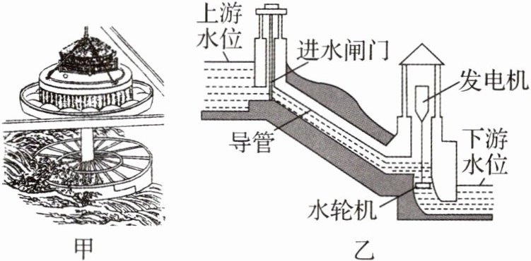 2. 人类文明,一脉相传.从古代的水磨,到今天的水电站,都是人类对水能的合理开发与利用.如图甲是古代的水磨,流水冲击水轮,水轮转动,去汲水、碾谷、磨面;图乙是水电站,流水冲击水轮,带动发电机发电.从能量转化和转移的角度来看,下列说法正确的是 (