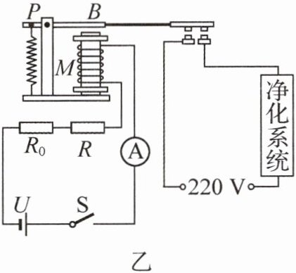 【方案设计】小组经过一番讨论和研究,设计了如图乙所示的空气质量检测仪电路,其中定值电阻$R_{0}=20 Ω$,电源电压 U 恒为 6 V 不变,用电流表示数表示对应空气质量指数;闭合开关 S,当电流表示数为 0.15 A 时,电路报警,此时电磁铁把衔铁 B 吸下来,净化系统开始工作,电磁铁中线圈的电阻不计.