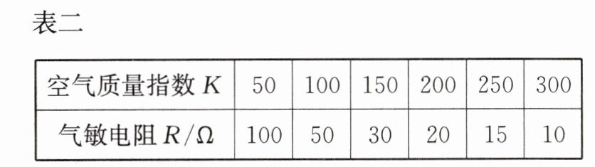 从学校科技实验员处借得一个气敏电阻 R,通过说明书获悉,其电阻值 R 随空气质量指数 K 变化的情况如表二所示.