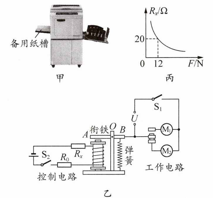 如图乙是晓舟设计的电路原理图,M₁、M₂是两台额定功率不同的电动机(规格如表所示),电动机工作时带动机体内的滚筒转动,从而完成“进纸”“印刷”等操作,电动机转速越大,印刷速度也越快.O为衔铁的支点,AO的长度是OB的1.5倍,在控制电路中,R₀是保护电阻,阻值为10Ω,电源电压为6V,Rₓ是安装在备用纸槽底部的力敏电阻,其阻值与受到纸张的压力成反比,关系图像如图丙.印刷时先闭合S₂,后闭合S₁,当控制电路中的电流大于或等于0.2A时,衔铁被吸引,只有电动机M₁工作.印刷时所用纸张规格相同,每500张纸的重力为20N.