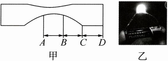 6. 如图甲,将锡纸条的中间剪掉一些,已知 AB、BC、CD 长度相等,如图乙,将锡纸条接在电池两极,很快锡纸条开始冒烟、着火.下列关于该实验现象的分析正确的是(