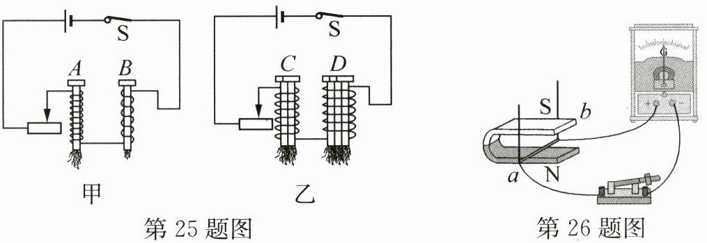 答案:25.(1)个数 (2)电流大小 铁芯形状 强 (3)控制变量法 (4)有关 解析:(1)电磁铁磁性的强弱是通过吸引大头针的个数反映出来的,吸引大头针个数越多,说明电磁铁的磁性越强,运用了转换法.(2)由图甲可知,电磁铁A和B串联在电路中,所以通过它们的电流相同,铁芯相同,A电磁铁的线圈的匝数较多,吸引的大头针个数较多,说明A电磁铁的磁性比较强.所以可以得出的结论是当电流大小、铁芯形状相同时,线圈的匝数越多,电磁铁的磁性越强.(3)探究电磁铁的磁性强弱跟电流大小、线圈匝数多少、铁芯的形状是否有关,需要改变其中一个因素,控制其他因素不变,用到控制变量法.(4)由图乙可知,两个线圈的匝数和通过它们的电流相同,铁芯的形状不同,电磁铁D吸引的大头针个数多,说明电磁铁磁性强弱与铁芯的形状有关.