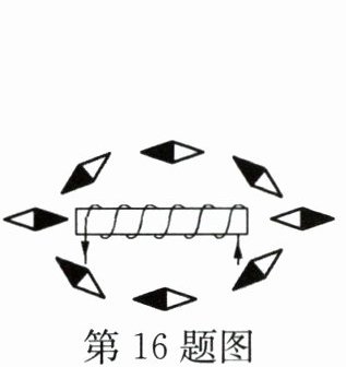 16. 在探究“通电螺线管的外部磁场分布”的实验中,小明在螺线管周围摆放了一些小磁针,通电后小磁针静止时的指向和分布如图所示,可判断通电螺线管外部的磁场与