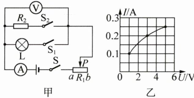 12. (扬州江都二模)如图甲所示,电源电压保持不变,R₁ 标有"50 Ω 0.5 A"的字样,R₂=10 Ω,灯泡 L 上标有"5 V"的字样,电压表量程为 0~15 V,电流表量程为 0~0.6 A.将 R₁ 的滑片 P 移至 b 端,仅闭合开关 S、S₁,调节 R₁ 的滑片 P,并绘制出电流表示数与电压表示数的变化关系图像如图乙所示.在保证电路安全前提下,下列说法正确的是
