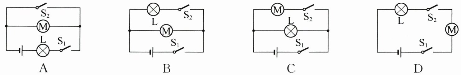 D选项:$S_1$、$S_2$均闭合时,指示灯L与电动机M串联,需两者同时工作,不符合“扫码后仅指示灯亮”的条件。