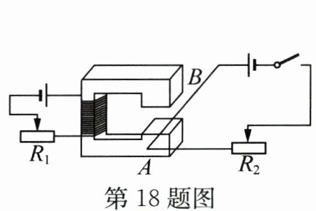 答案:18.右 磁场的强弱 左 解析:由图可知,左侧构成了电磁铁,移动$R_{1}$的滑片可改变AB所处磁场的强弱,通电导线AB在磁场中受力,其受力的大小与磁场的强弱和电流的大小有关,将滑动变阻器$R_{1}$的滑片向右移,左侧电路中电流增大,电磁铁磁性增强,导线AB受力摆动幅度增大,说明磁场对通电导体的作用力与磁场的强弱有关;将滑动变阻器$R_{2}$的滑片向左移,导线AB中电流增大,导线AB受力摆动幅度也增大,说明磁场对通电导体的作用力大小与电流的大小有关.