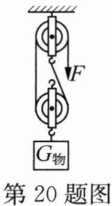 答案:20.$1.2$ $2$ $83.3$ 不变 解析:由图可知,动滑轮上绳子的段数$n=2$,物体上升的高度$h=20cm=0.2m$,则绳自由端拉力的功率$P=\frac{W}{t}=\frac{F_{s}}{t}=\frac{Fnh}{t}=\frac{6N×2×0.2m}{2s}=1.2W$;不计绳重和摩擦,拉力$F=\frac{1}{n}(G_{物}+G_{动})$,则动滑轮的重力$G_{动}=nF-G_{物}=2×6N-10N=2N$;滑轮组的机械效率$\eta=\frac{W_{有用}}{W_{总}}×100\%=\frac{G_{物}h}{Fnh}×100\%=\frac{G_{物}}{nF}×100\%=\frac{10N}{2×6N}×100\%\approx83.3\%$;不计绳重和摩擦,额外功即为克服动滑轮重力做的功,改变图中滑轮组的绕线方法,提起同一重物时,滑轮组的机械效率$\eta=\frac{W_{有用}}{W_{有用}+W_{额外}}×100\%=\frac{G_{物}h}{G_{物}h+G_{动}h}×100\%=\frac{G_{物}}{G_{物}+G_{动}}×100\%$,$G_{物}$、$G_{动}$均不变,则滑轮组的机械效率将不变.