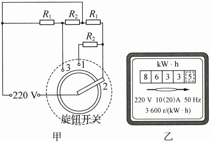 28. (12 分)图甲为一款家用电火锅的简化电路图,其中 $ R_1 $、$ R_2 $ 为定值电阻,$ R_1 = 44 $ Ω.旋钮开关可实现高、中、低三个挡位的切换.当开关处于图甲所示位置时,电火锅为中温挡,电路中的电流为 5 A.求: