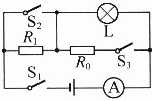答案:27.(1)$0.5A$ (2)$24\Omega$ (3)$0.9W$ 解析:(1)灯泡L正常发光时的电流$I_额 = \frac{P_额}{U_额} = \frac{3W}{6V} = 0.5A$.(2)由图可知,只闭合$S_1$、$S_2$,灯泡L单独工作,电流表测电路中电流,此时灯泡L正常发光,则电源电压$U = U_额 = 6V$;再闭合$S_3$,灯泡L和$R_0$并联,电流表测干路电流,电流表示数变化了$0.25A$,由并联电路的电流规律可知,通过$R_0$的电流为$0.25A$,则电阻$R_0$的阻值$R_0 = \frac{U}{I_0} = \frac{6V}{0.25A} = 24\Omega$.(3)灯泡L的电阻$R_L = \frac{U_额}{I_额} = \frac{6V}{0.5A} = 12\Omega$,只闭合$S_1$时,灯泡L和$R_1$串联,此时电路的总电阻最大,由$P = \frac{U^{2}}{R}$可得,整个电路消耗的功率最小为$P_小 = \frac{U^{2}}{R_1 + R_L} = \frac{(6V)^{2}}{28\Omega + 12\Omega} = 0.9W$.