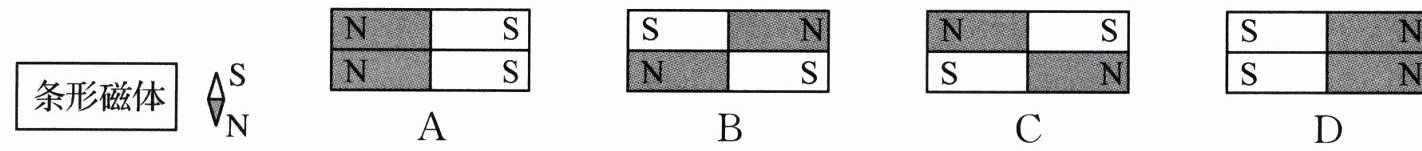 D:左侧上下均为S极,右侧均为N极,整体左侧S极,右侧N极,但上下磁极分布与B不同,根据磁场叠加,B选项左右两侧分别形成S、N极,符合要求。