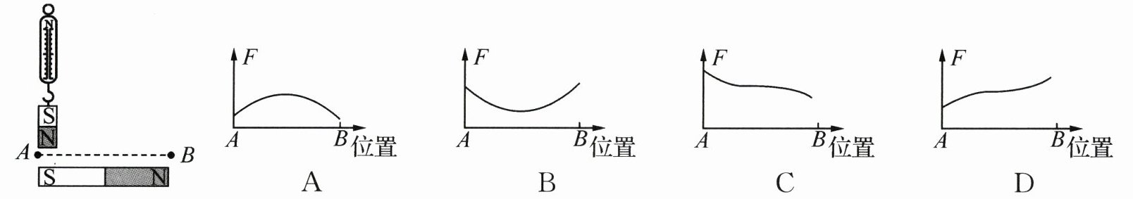 科学思维如图所示,放在水平地面上的磁体上方有一块挂在弹簧测力计上的小磁体(下部为N极)。小辉提着弹簧测力计沿图示水平路线从A缓慢移到B,则下列图像能反映弹簧测力计示数F随位置变化的是(