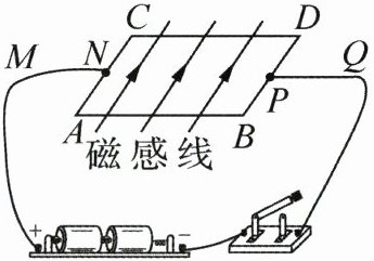 答案:11.D 解析:电路中M与Q都在干路中,所以电路中M处的电流等于Q处的电流,故A错误;闭合开关后,AB段导体受到向上的磁场力,电流方向是A到B,CD段导体中电流方向是C到D,可判断出CD段导体受到磁场力的方向也向上,故B错误;因为AB段和CD段受到的磁场力方向相同,所以一定不发生转动,故C错误;若只将电源正负极对调,CD段导体中电流方向变为D到C,由通电导体在磁场中的受力方向与电流方向的关系可知,CD段受到磁场力的方向一定向下,故D正确.