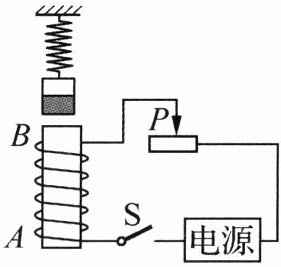 D.若滑动变阻器的滑片P不动,抽去电磁铁铁芯,弹簧将变长