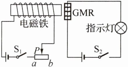 8. (2025·黑龙江龙东地区·2分)如图,电路中的$ GMR $是巨磁电阻(其阻值随周围磁场强度的增强而减小),当开关$ S_{1} $和$ S_{2} $闭合时,将滑片$ P $向左移动,下列说法正确的是 (