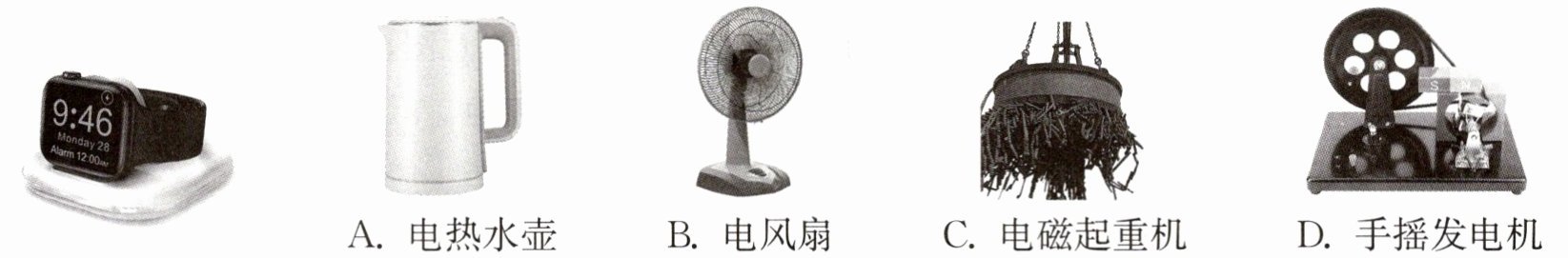 电话手表无线充电利用电磁感应原理,即闭合电路的一部分导体在磁场中做切割磁感线运动时产生感应电流。A选项电热水壶利用电流的热效应;B选项电风扇主要部件是电动机,利用通电导体在磁场中受力运动原理;C选项电磁起重机利用电流的磁效应;D选项手摇发电机利用电磁感应原理,与无线充电原理相同。