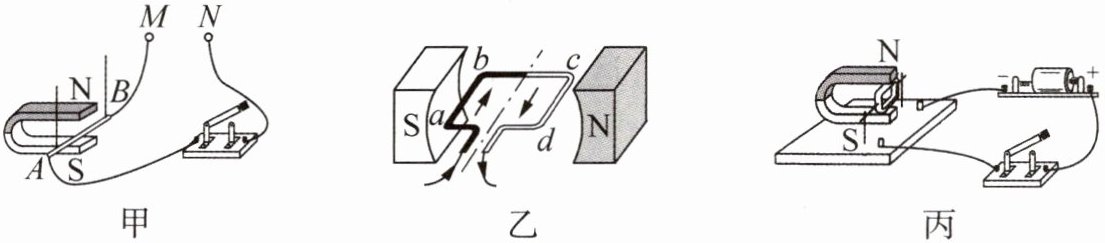 (3) 小明自制了一个电动机(如图丙所示),将线圈漆包线两端的漆全部刮去后,用导电支架托住,放入磁场中. 闭合开关,发现线圈不能持续转动,只能在平衡位置附近摆动. 为了使线圈能持续转动,正确的刮漆方法应该是下列哪两种?
