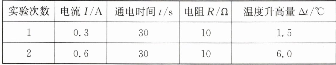 (2) 小文测量烧瓶内液体的温度后,闭合开关,通电30s再测量烧瓶内液体的温度;然后移动滑动变阻器滑片改变电流大小,重复上述操作(记录数据如表)。