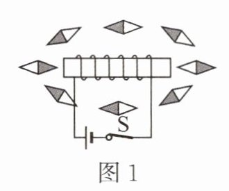 (1) 如图1,观察通电螺线管周围的小磁针指向状态,可知通电螺线管的外部磁场与